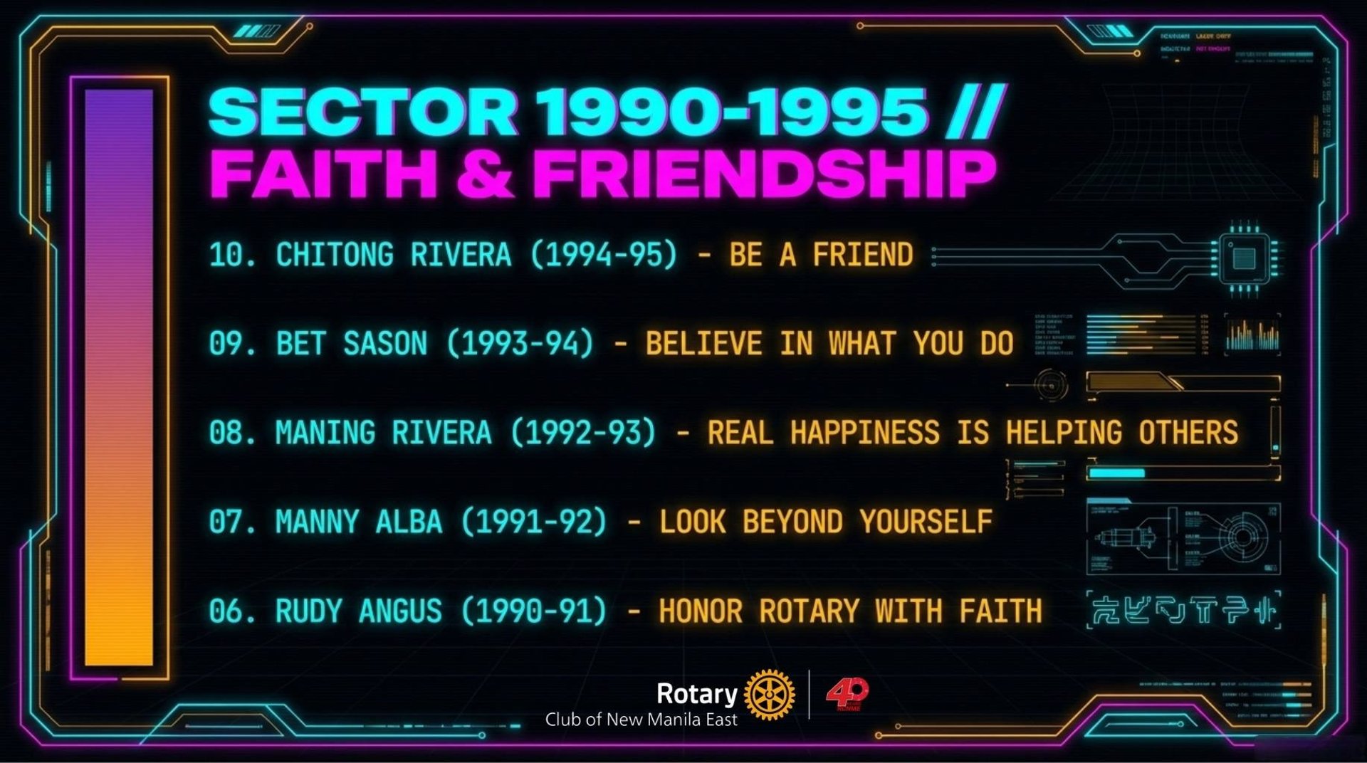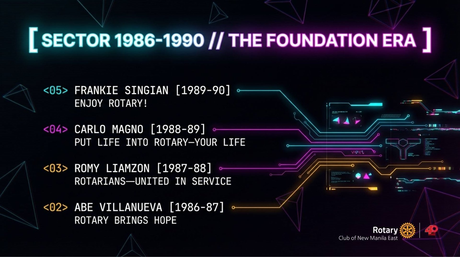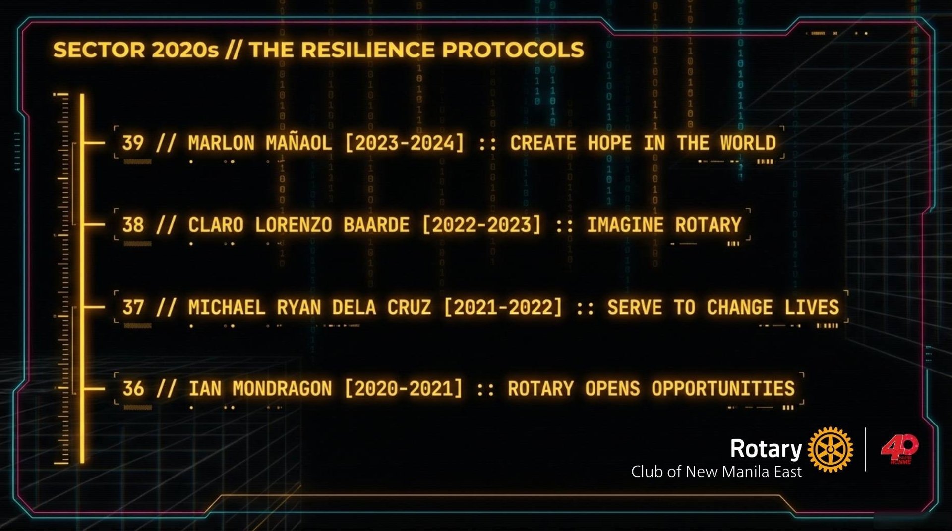 Spanning from its founding in 1984 to the present day, the record identifies forty distinct presidents and the specific years they held office. Each leader is associated with a motivational slogan that reflects the organization's shifting focus, ranging from global community building to individual acts of humanitarian service. The list culminates with Karlo Benjamin Nisce, the current president presiding over the group’s ruby anniversary.