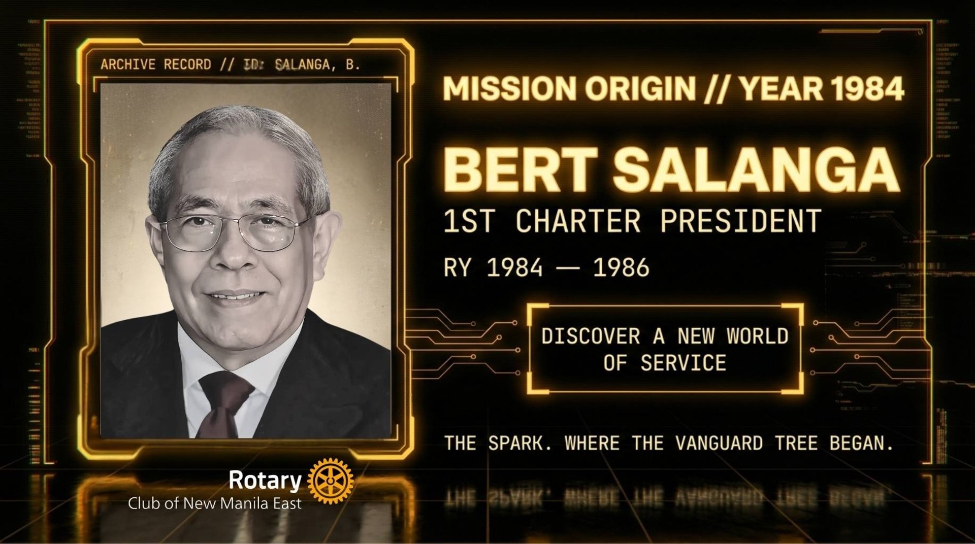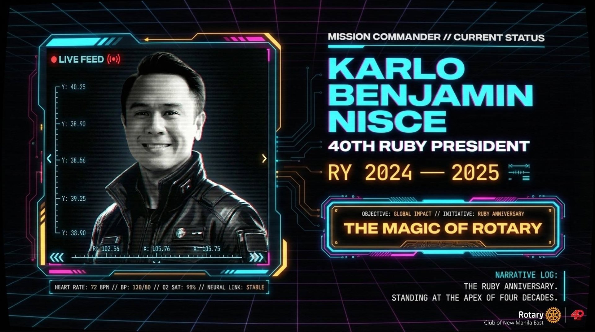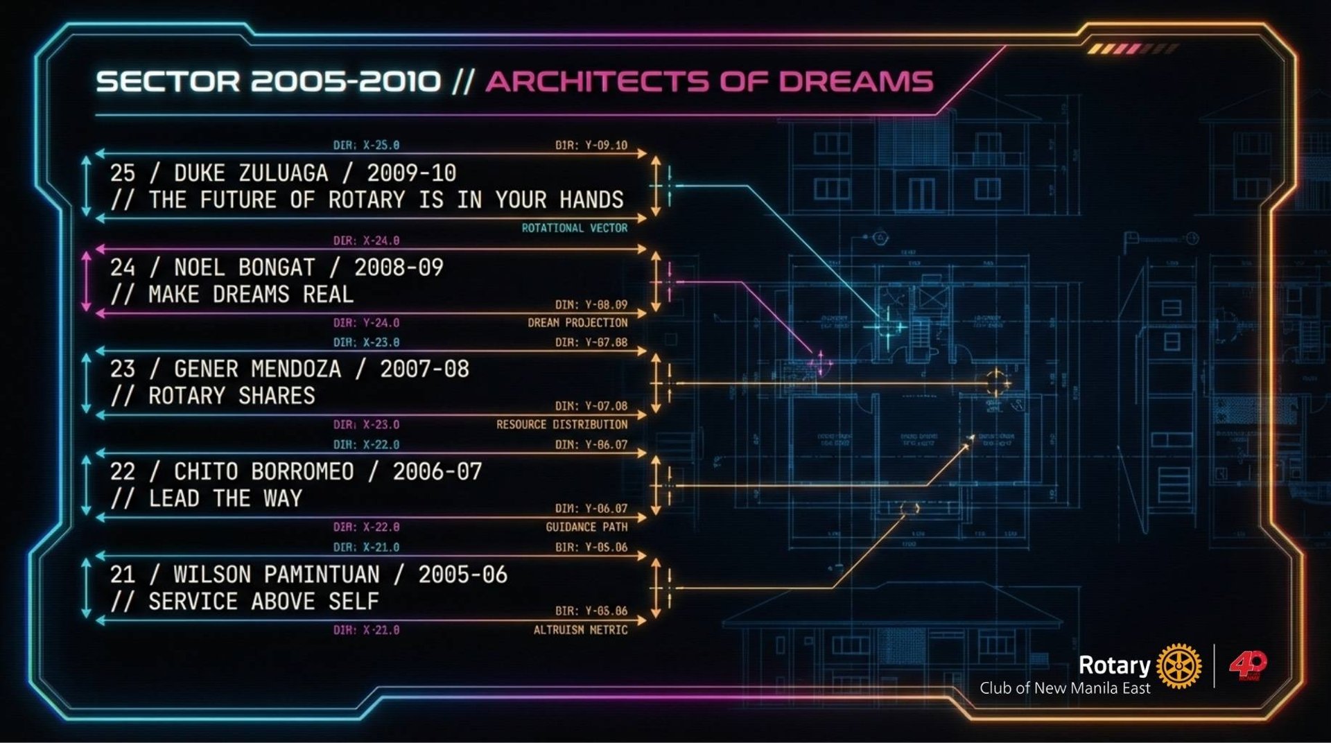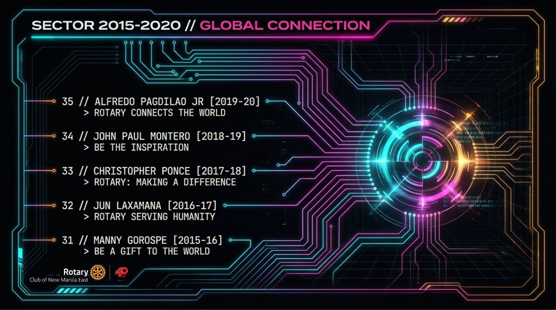 Spanning from its founding in 1984 to the present day, the record identifies forty distinct presidents and the specific years they held office. Each leader is associated with a motivational slogan that reflects the organization's shifting focus, ranging from global community building to individual acts of humanitarian service. The list culminates with Karlo Benjamin Nisce, the current president presiding over the group’s ruby anniversary.
